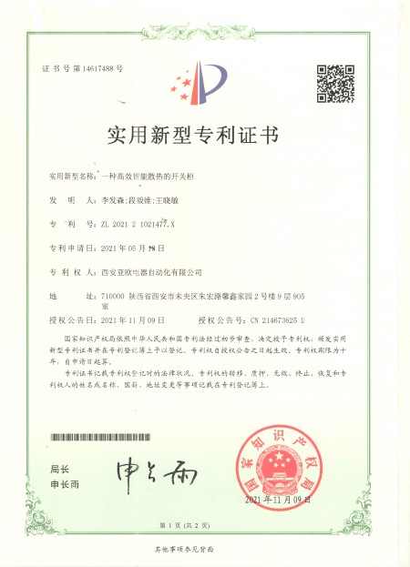 - 關于我們 - 資質榮譽 - 一種高效智能散熱開關柜專利
